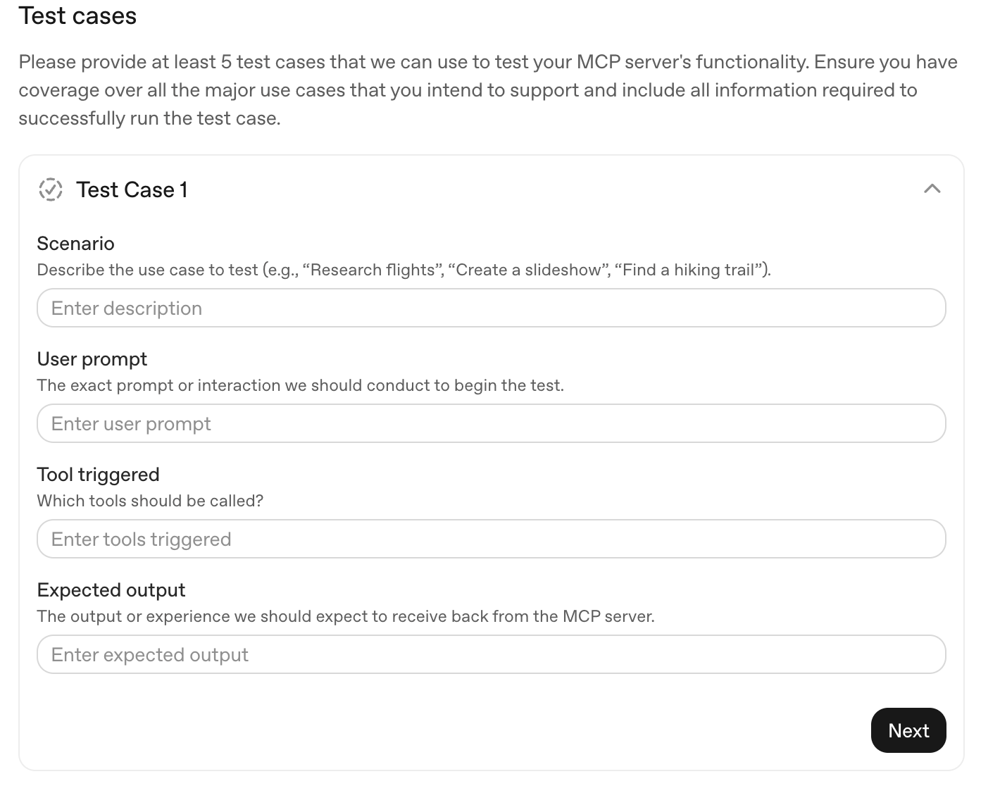 OpenAI reviewers will actually test your app using these scenarios. For each test case, provide: